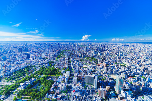 © show999, Fototapeta premium Krajobraz miasta Osaka Kansai Japonia Panorama Kita Wysoki kąt widok z lotu ptaka Czyste błękitne niebo Urban business real estate