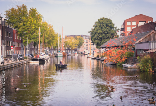 © Aga Bak, Fototapeta premium Krajobraz miejski widok na kanał, domu, łodzie w Gouda, Holandia.
