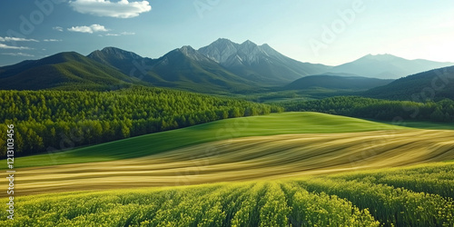 © Silent26, Fototapeta premium Krajobraz pola z pofałdowaną powierzchnią, widoczne góry