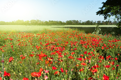 © Виктор Ткачев, Fototapeta premium Krajobraz pole maku. Słoneczny dzień. Czerwone kwiaty