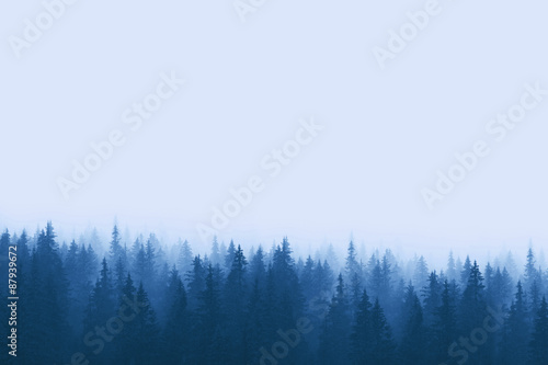 © Sensay, Fototapeta premium Krajobraz w odcieniach błękitu - las sosnowy w górach z mgłą