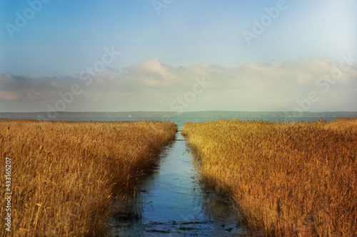 © Monika, Naklejka premium Krajobraz wodny zalew zarośnięty trzcinami z utworzonym torem wodnym