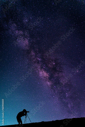 Naklejka premium Krajobraz z galaktyką Drogi Mlecznej. Nocne niebo z gwiazdami i sylwetką Fotograf robi zdjęcie na górze.