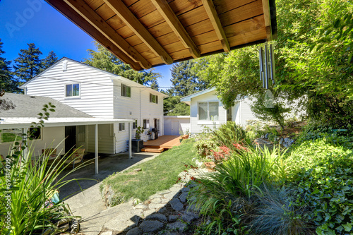 © Iriana Shiyan, Obraz premium Krajobraz zielonego podwórka. Widok na dom z tarasem i tarasem