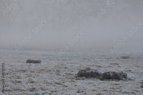 Obraz premium Krajobraz zimą - mgła na polu