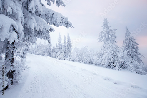 Fototapeta premium Krajobraz zimowy w górach, białe zaśnieżone drzewa