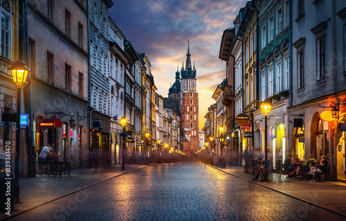 Fototapeta premium Krakow evening view of Florianska Street leading toward St Mary’s Basilica...
