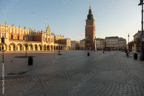 © Marnix, Naklejka premium Krakow, Poland - 04.09.2020: the market hall, tower and the empty Market Square during golden hour