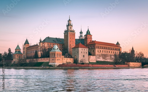 Fototapeta premium Krakow's Wawel Castle, Poland Majestic castle on river at sunset.