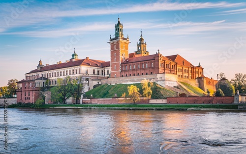 Naklejka premium Krakow's Wawel Castle, Poland Majestic Wawel Castle at sunset, overlooking the Vistula River.
