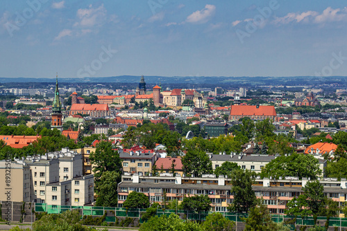 Obraz premium Krakus Mound with an amazing view of of Podgorze District in Krakow and the historical part of Krakow old town with Wawel castle and Corpus Christi Basilica, Poland.