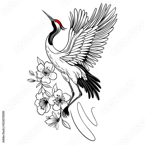 © christine krahl, Fototapeta premium Kranich mit Kirschblüten. Frühling Vektor.