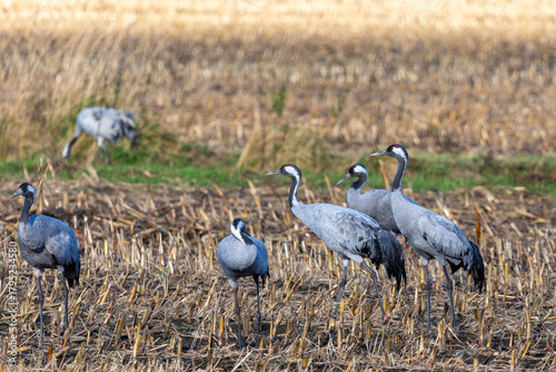 © Karl, Fototapeta premium Kraniche auf abgeernteten Maifeld in der Region Zingst an der Ostsee.