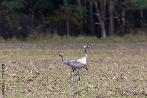 Obraz premium Kraniche auf abgeernteten Maifeld in der Region Zingst an der Ostsee.