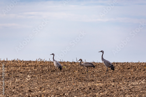Obraz premium Kraniche auf abgeernteten Maifeld in der Region Zingst an der Ostsee.