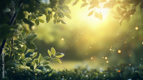 Naklejka premium Kreatywne tło na świeżym powietrzu wypełnione jest bujną zielenią drzew i...