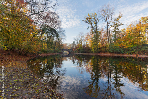Fototapeta premium Krefeld - View to Bridge at City Lake in autumn mood in the early morning /...
