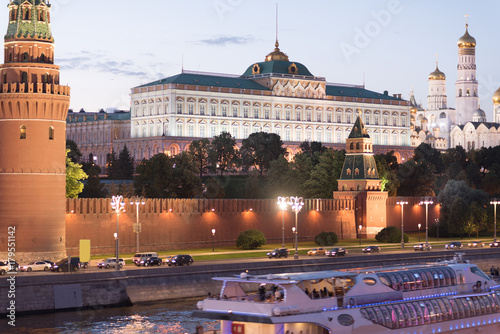 Naklejka premium Kremlin wall, Ivan Great bell tower and Grand Palace at evening in Moscow,...