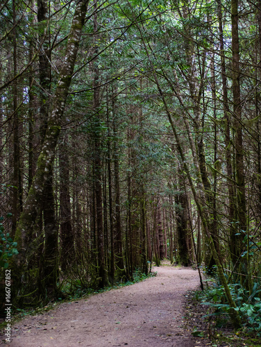 © John M. DeMarco, Fototapeta premium Kręta droga gruntowa przez las deszczowy sosen z rozproszonym światłem