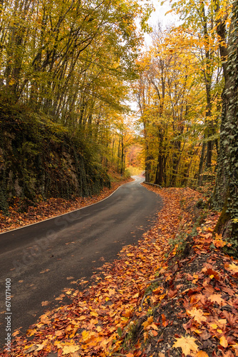 © Jarosaw, Fototapeta premium Kręta droga w lesie i jesień w pełnej krasie