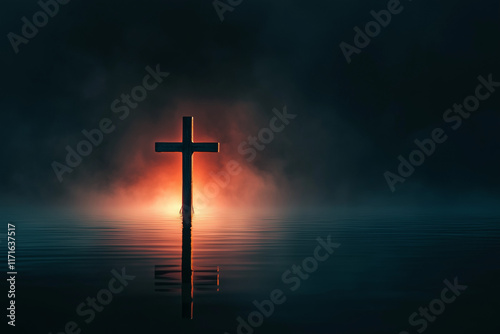 © Cedric, Fototapeta premium Kreuz in ruhigem Wasser vor sanftem, blauem Licht