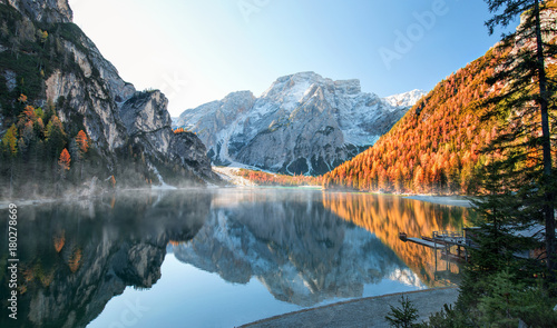 © Cara-Foto, Naklejka premium kristallklarer Gebirgssee mit Nebelschwaden vor Felslandschaft