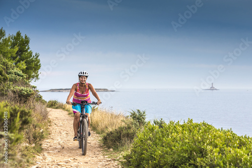 © mmphoto, Fototapeta premium Kroatien, Istrien, Pula, Kap Kamenjak, Mountainbiker auf dem Trail am Meer