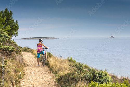 © mmphoto, Fototapeta premium Kroatien, Istrien, Pula, Kap Kamenjak, Mountainbiker auf dem Trail am Meer