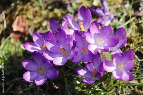 Fototapeta premium Krokusse lila orange auf einer Blumenwiese im Frühling.