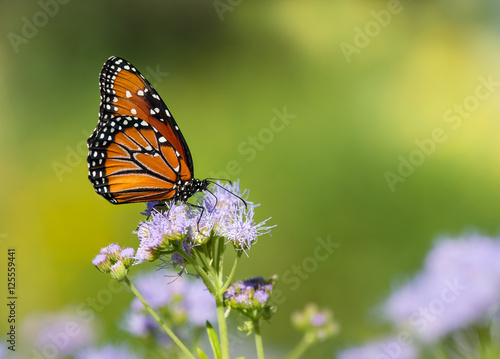 © leekris, Naklejka premium Królowa motyli (Danaus gilippus) żerująca na mglistych kwiatach Greggsa (Conoclinium greggii) w jesiennym ogrodzie. Naturalne zielone tło z miejsca na kopię.