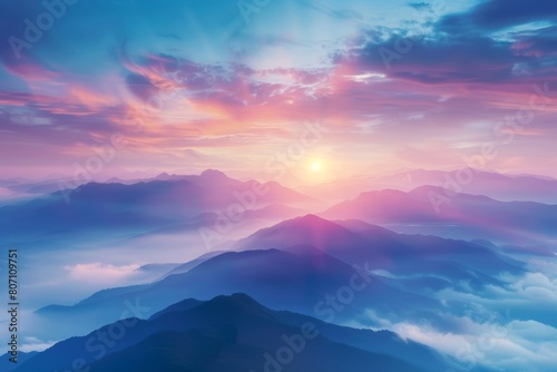 © Punn, Fototapeta premium KSBeautiful misty valley at sunrise aerial view of mount