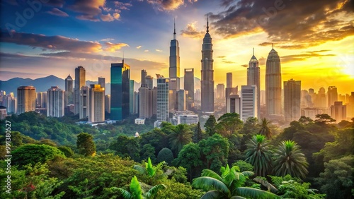 Fototapeta premium Kuala Lumpur, architecture, contrast, beauty, modern, Skyline of Kuala Lumpur at sunset with its iconic skyscrapers framed by a lush and dense macro view of the surrounding jungle