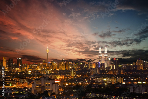 © chinheng, Obraz premium Kuala Lumpur, Malaysia city skyline during blue and red hour sun