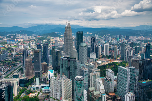 © jovannig, Fototapeta premium Kuala Lumpur, Malaysia - December 28, 2019: Dramatic aerial view of Kuala Lumpur skyline on a cloudy day with misty skyscrapers