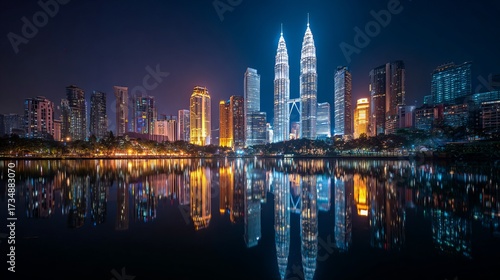 © Mishi Images, Obraz premium Kuala Lumpur skyline at night with illuminated skyscrapers and city architecture