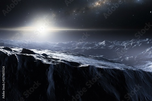 © bartjan, Fototapeta premium Kuiper Belt object beyond Neptune, encircled by a thin stellar dust ring, captured by a New Horizons spacecraft, using a Long Range Reconnaissance Imager --v 6.1 --ar 3:2