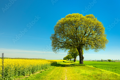 Obraz premium Kulturlandschaft im Frühling, Raps- und Getreidefelder, Feldweg, alte Lindenbäume
