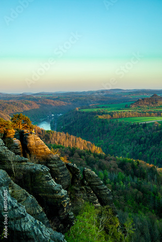Fototapeta premium Kurze Abendwanderung zu den Schrammsteinen bei Bad Schandau - Sächsische Schweiz - Deutschland