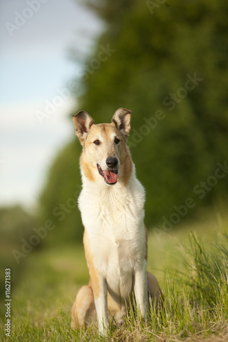 Fototapeta premium Kurzhaar Collie sitzt in der Wiese