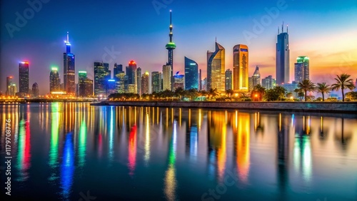 © prapatsorn, Fototapeta premium Kuwait City Waterfront Night Panoramic - Cinematic 4K Slow Panning Shot