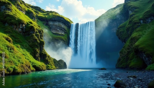 Fototapeta premium Kvernufoss waterfall, its curtain of water framed by lush greenery, green, peaceful