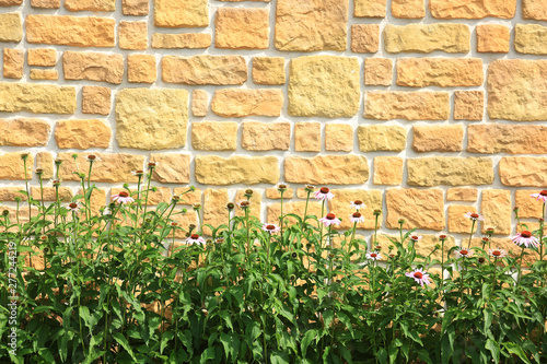 Obraz premium Kwiaty i zieleń na tle pięknej ściany z kamienia.