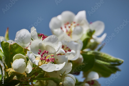 © Marek Szymski, Fototapeta premium Kwiaty jabłoni, gruszy na tle błękitnego nieba