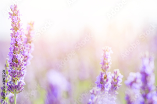 Naklejka premium Kwiaty lawendy w słońcu w miękkiej ostrości, pastelowych kolorach i rozmycie...