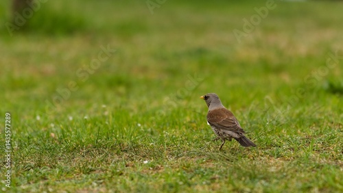 © Piotr, Fototapeta premium Kwiczoł na trawie obok żółtych kwiatów
