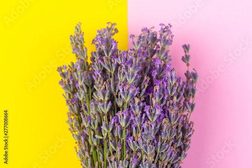 Fototapeta premium Kwitnąca fioletowa lawenda, na żółtym różowym tle