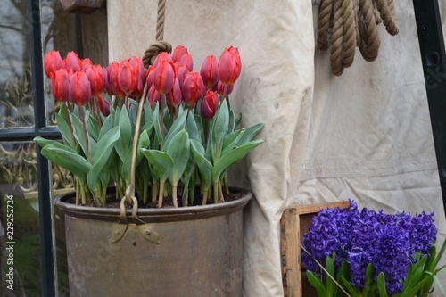 © Ewa, Naklejka premium Kwitnące czerwone tulipamy w ozdobnym metalowym wiadrze