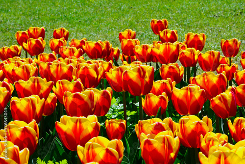 Naklejka premium kwitnące tulipany, czerwono-żółte tulipany, tulipa, blooming tulips, red and yellow tulips in spring