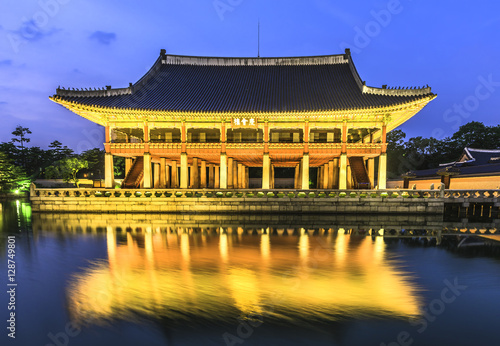 © chanchai, Fototapeta premium Kyeongbokgung palace reflection at night,South Korea.