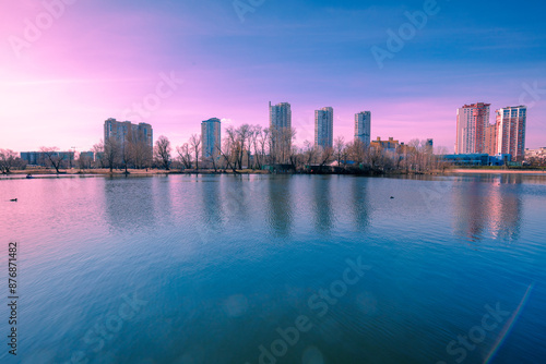 Naklejka premium Kyiv in the morning. Left bank of the Dnieper River. Beautiful reflection of buildings in the lake